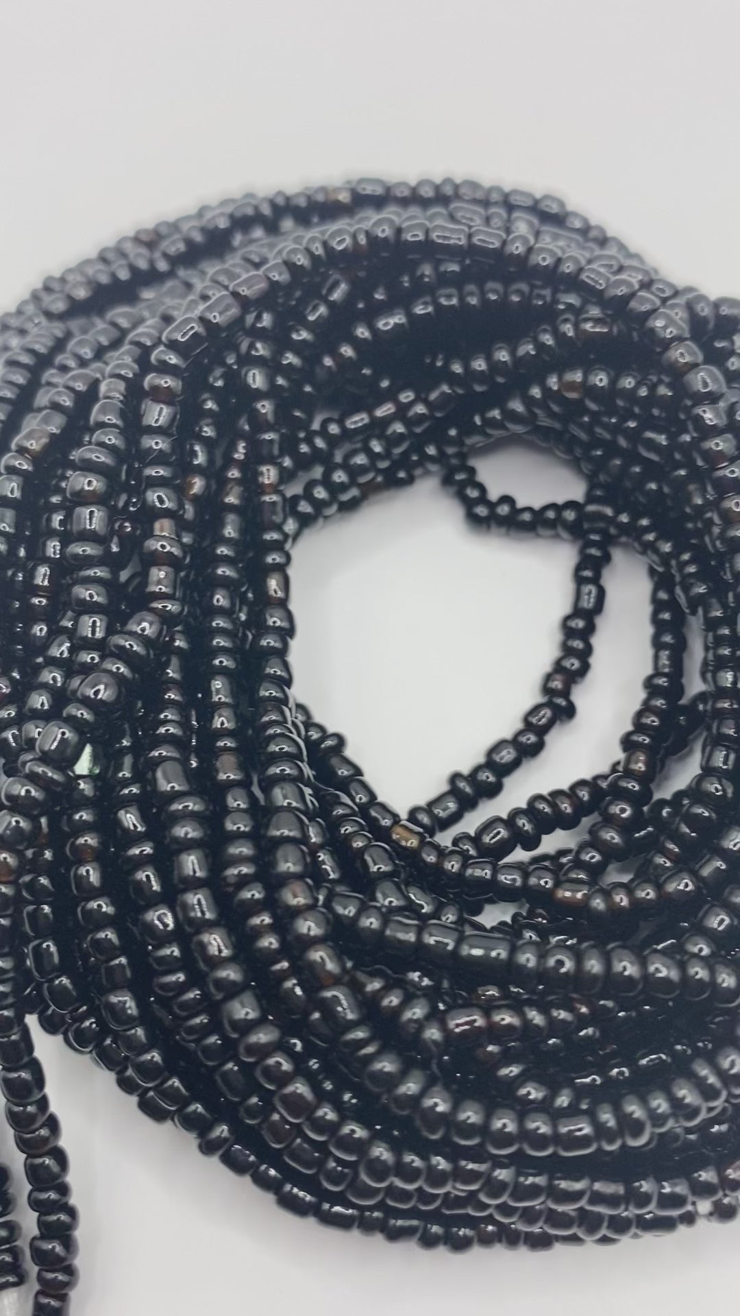 Solid Black size 6 glass beads stringed on 100% Nylon Thread, 50 inches in length which fits up to size 3 XL. Perfect starter waistbead!